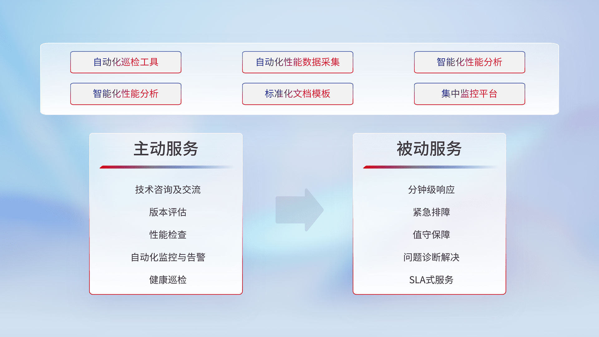 智能化工具和标准化文档,,保障服务质量,,,,提供主动服务(包含技术咨询、、版本评估、、、、性能检查、、、自动化监控与告警、、健康巡检)和被动服务包含(分钟级响应、、、紧急排障、、、值守保障、、问题诊断解决、、SLA服务)。。